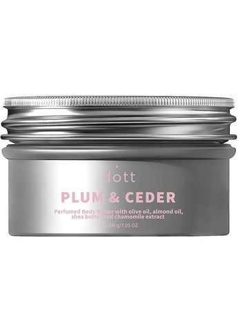 Парфумований батер для тіла глибоко насичує шкіру корисними речовинами та стимулює процеси її регенерації. Основні "помічники" в цьому процесі - масло оливи, мигдаля, масла ши та екстракт ромашки. Батер забезпечує епідермісу інтенсивне зволоження, надійно захищає його від агресивного впливу факторів навколишнього середовища, усуває відчуття стягнутості та запобігає появі лущення. Масло ши та мигдаля делікатно пом'якшують грубі ділянки шкіри, роблять шкірний покрив шовковистим, оксамитовим та ніжним. Екстракт ромашки має антисептичні властивості та активізує регенерацію шкіри. Парфумована композиція нішевого аромату на тілі розкривається по-особливому і відчувається протягом декількох годин. Запах Plum & Cedar: солодкий та свіжий Верхні ноти: Гранат, Слива, Малина Ноти серця: Гвоздика, Рожевий Перець, Жасмин, Конвалія, Дерево Гуаяк Базові ноти: Кедр з Вірджинії, Пачулі, Мускус, Амбра і Пряність