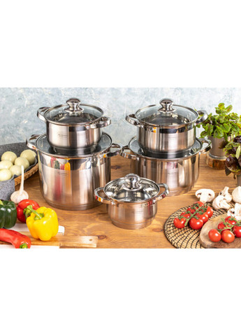 Набір каструль Edenberg EB-4009 Набір каструль Edenberg EB-4009 виготовлені з високоміцного та екологічно чистого матеріалу з нержавіючої сталі. Також посуд має кришку, яка максимально щільно прилягає до корпусу. Каструлі мають зручну ручку. Можна мити в посудомийній машині. Характеристики: Тип: набір каструль Матеріал: нержавіюча сталь Матеріал кришок: жароміцне скло Кількість предметів: 10 Можна мити в посудомийній машині Багатошарове дно Підходить для всіх типів плит Колір: сірий Виробник: Edenberg Комплектація: Каструля з кришкою 16 см 2,1 л: 1 шт Каструля з кришкою 18 см 3 л: 1 шт Каструля з кришкою 20 см 4 л: 1 шт Каструля з кришкою 24 см 6,6 л: 1 шт Каструля з кришкою 28 см 9 л: 1 шт