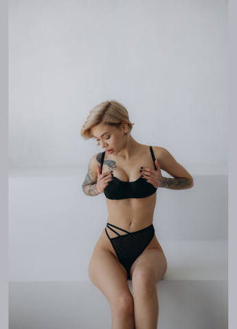Комплект білизна з чорного мережива Шантільї . На спинці декоративна потрійна застібка. Чашка ліфу декорована потрійною бретеллю. В комплекті стрінги з високою посадкою на подвійній бретелі