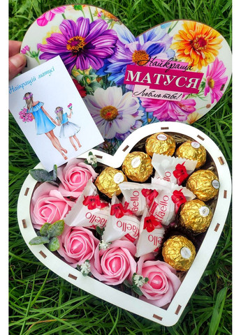 Бокс сердце з цукерками Ferrero и Raffaello (x006) Бокс сердце з цукерками. Гарний подарунок для мами Склад: цукерки Raffaello 6 шт цукерки Ferrero Rocher 7 шт мильні троянди 5 шт дерев'яний бокс сердце вітальна листівка Розмір: довжина 20 см ширина 23 см висота 9 см