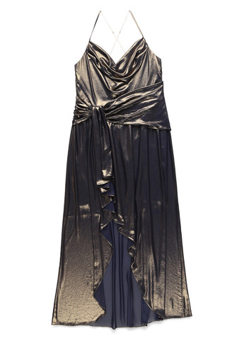 Жіноча сукня-міні виконана з легкої тканини. Модель поєднує вертикальні смуги пастельно-блакитного та білого відтінків, доповнені мереживними вставками та прозорими сітчастими фрагментами. Кокетливі волани на плечах додають романтичності, а низ прикрашений декоративною мереживною облямівкою з геометричним візерунком. Ідеальний варіант для прогулянок, побачень та літніх заходів.