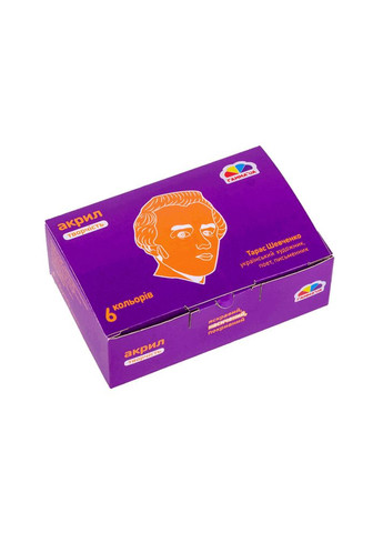 Акрилові фарби призначені для живопису та декоративних робіт. Відрізняються яскравими та чистими кольорами. Має високу покривну властивість, легко наносяться на папір, картон, ґрунтоване полотно, дерево, метал, тканину. Під час висихання створюють еластичну плівку, що не змивається.Випускається в наборах 6 кольорів в баночках по 10 та 20 мл. Упаковуються набори в коробки з відкидною верхньою кришкою.Кольори в наборі: червоний, жовтий, білий, зелений, чорний, синій.