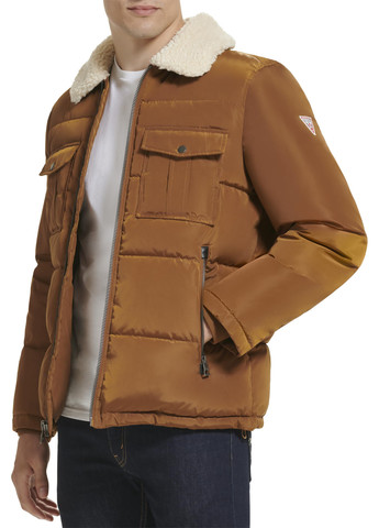 Чоловіча куртка Guess. Стильна та тепла куртка Guess з коміром із шерпи. Застібається на блискавку. Дві зовнішні кишені на блискавці, дві на кнопках і одна внутрішня кишеня.  Довгі рукави з еластичними манжетами. Куртка з ідеальною універсальною посадкою. Низ прямий. Брендована лейба на рукаві. Відмінна якість.