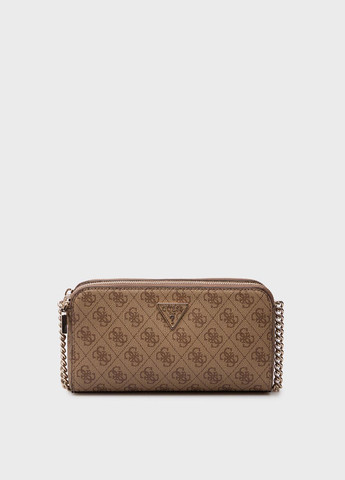 Стильна модель із фірмовим монограмним принтом, виготовлена з якісної екошкіри у теплих бежево-коричневих відтінках. Модель має прямокутну форму та закривається на блискавку, що забезпечує надійне зберігання речей. Передню частину прикрашає декоративна вставка з ланцюговим елементом у чорному кольорі, що додає контрасту та характеру. Широкий текстильний ремінець з логотипом GUESS регулюється по довжині — для зручного носіння через плече або на одному плечі. Декоративна брендова підвіска надає аксесуару завершеного вигляду. Ця сумка ідеально підходить для щоденного використання — практична, легка та стильна. Чудово поєднується з кежуал, міськими та street-style образами.
