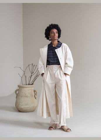 Пальто Florence - це довге, велике, без підкладки, пальто розслабленого стилю. Воно має безкомірний виріз горловини з пришивною планкою, спущені плечі, накладні кишені та довгі рукави з відвернутими манжетами, бічні розрізи. Передня частина пальта сидить без напусків, що робить його ідеальною легкою багатошаровою річчю.