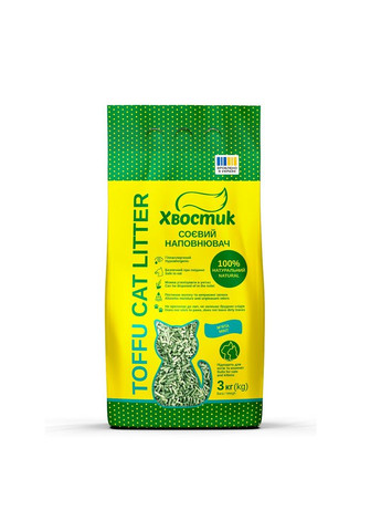 Соєвий наповнювач ТМ «Хвостик» – наповнювач, виготовлений з натуральної сировини, відзначається відмінною здатністю поглинати вологу і формувати грудочки, що робить прибирання легким та зручним. Його 100% натуральний склад без хімічних добавок не лише безпечний для здоров’я тварин, але й повністю біорозкладний, що робить продукт дружнім до навколишнього середовища. Наповнювач ефективно запобігає поширенню неприємних запахів та бактерій, забезпечуючи свіжість та гігієнічність у приміщенні. Переваги: - 100% натуральні складові - Швидко поглинає вологу - Формує грудочки, які легко прибирати без розсипання - Дбайливий до ніжних лапок котів, не викликає подразнень - Не розноситься за лапками, не залишає брудних слідів- Безпечний при поїданні- Економне використання Інструкція щодо використання: Насипте наповнювач у сухий чистий лоток шаром не менше 5 см. Регулярно прибирайте грудки, що утворились. Грудки можна утилізувати в унітаз (для запобігання засмічення каналізаційних труб рекомендуємо змивати в унітаз невеликі порції наповнювача). По мірі необхідності досипайте наповнювач до рівня 5 см. Перемішуйте вміст лотка раз в 1-2 дня Вага: 3 кг Аромат: без аромату