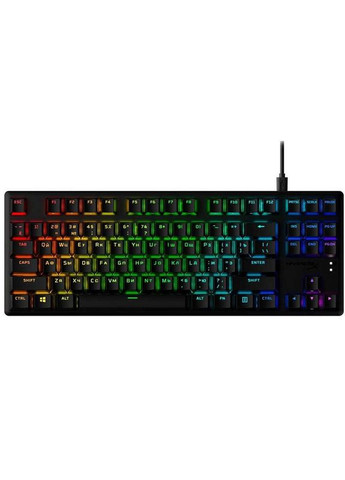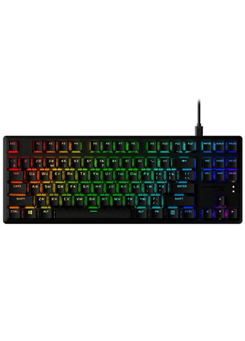 Ультракомпактна, міцна безклавішна клавіатура, оснащена спеціальними механічними перемикачами HyperX, розробленими для того, щоб дати геймерам найкраще поєднання стилю, продуктивності та надійності. Довговічність клавіатури PBT підвищується завдяки попередньо встановленим кришкам клавіш з бічним друком. Механічні перемикачі клавіш HyperX виготовлені з відкритими світлодіодами, тому більша частина світлового потоку видима, забезпечуючи більш яскраве, приголомшливе освітлення. Високоякісні та міцні ковпачки клавіш PBT. Ці ковпачки для клавіш PBT приємні на дотик і ще довговічніші. Бічний друк на ковпачках клавіш допомагає зробити важливі функції клавіатури помітнішими і менше зношується з часом. Механічні перемикачі HyperX. Клавішні перемикачі, розроблені HyperX, поєднують у собі чуйність і точність, а також короткий час переміщення та низьке зусилля спрацьовування. Вони також надійні, розраховані на 80 мільйонів клавіш без втрати якості. Міцна конструкція: корпус з авіаційного алюмінію. Алюмінієвий корпус робить клавіатуру структурно міцною та стабільною, коли дія стає інтенсивною, а гра зависає; битва за битвою, ніч за ніччю. Компактна конструкція без ключа для максимального збільшення простору Вишуканий форм-фактор без клавіш дає вам більше місця для швидких рухів миші, особливо в настільних конфігураціях, які занадто тісні для повнорозмірної клавіатури. Сяючі світлові ефекти RGB. Механічні перемикачі HyperX оснащені відкритим світлодіодом для яскравішого та яскравішого RGB-підсвічування. Розширене налаштування за допомогою програмного забезпечення HyperX NGENUITY. Налаштуйте ігровий режим, отримайте більший контроль над світловими ефектами та налаштуйте свої власні макроси. Три регульовані кути нахилу клавіатури. Відрегулюйте двоступінчасті ніжки клавіатури для трьох різних кутів (3°, 7° або 11°), залежно від того, що робить ваші зап’ястя найбільш зручними. Ігровий режим. Переконайтеся, що всі ваші натискання клавіш реєструються і що ви випадково не виходьте з гри у ключові моменти. Характеристики: Тип клавіш: механічні Додаткові клавіші: немає Цифровий блок: відсутній Джерело живлення: через інтерфейсний роз'єм Кількість клавіш: 87 Колір: Чорний Довжина кабеля: 1.8 м Підсвічування клавіш: є Габарити: 359 х 130 х 35 мм Вага: 990 г Радіус дії: - Тип підключення: дротове Розкладка: ENG / UKR USB: так PS/2: немає Bluetooth: немає USB-ресивер: немає Тип перемикачів: Red Наявність RGB: є Вологостійкість: немає Форм-фактор: компактна USB Type-C: немає Ігрова: так USB-приймач у комплекті: відсутній Гарантія, міс: 24