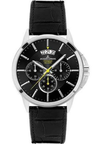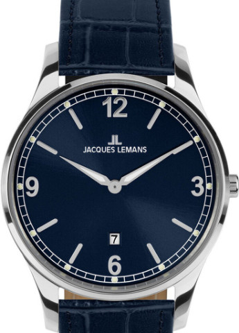 Тип ремінця: Шкіряний; Виробник: Jacques Lemans; Стать: Чоловічі; Підсвічування: Світлонакопичувачі на стрілках та цифрах/мітках; Тип індикації: аналогові; Стиль: Класика; Скло: Мінеральне; Колір синій; Розмір, мм: 42 мм; Форма корпусу: Круглі; Країна виробник: Австрія; Гарантія: 24 місяці; Хутроанізм: Кварцові; Матеріал: Нержавіюча сталь; Водонепроникність: 10 ATM; Колір: Сріблястий; Колір ременя: Чорний; Дод. фунц.: 12/24ч. формат часу;