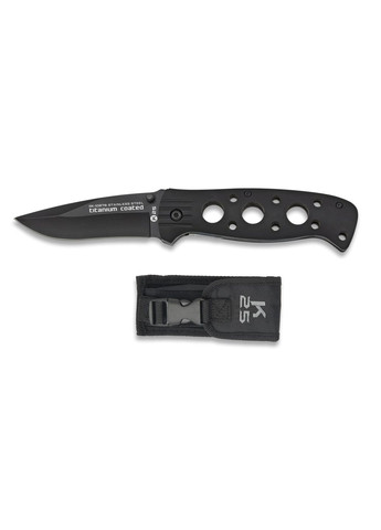 Характеристики Тип: кишеньковий ніж Довжина клинка: 87 мм Загальна довжина: 205 мм Товщина клинка: 3,5 мм Сталь клинка: нержавіюча сталь 7Cr17Mov із титановим покриттям Матеріал рукоятки: прогумований алюміній Колір ручки: чорний Вага: 185 г Тип замку: Liner Lock Особливості: отвір під темляк, стропоріз, склобій У чохлі є ремінь або кріплення для аксесуарів, що дозволяє носити ніж у вертикальному положенні Комплектація: нож, нейлоновий чохол, фірмова коробка