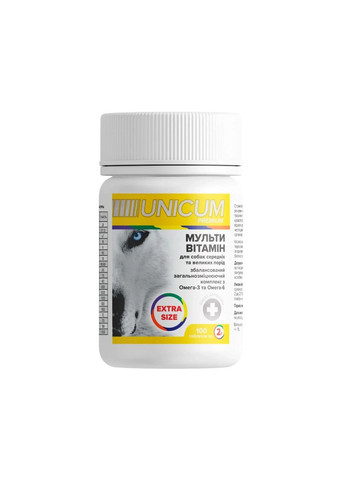 Вітаміни UNICUM Premium для собак EXTRA SIZE "Мультівітамін" - це збалансований комплекс вітамінів та мінералів для підтримки загального здоров'я, активності та імунітету собак середніх та великих порід. Препарат забезпечує тварину всіма необхідними речовинами для підтримки енергії, нормального обміну речовин та здорового зовнішнього вигляду. Основні переваги продукту: Комплексна підтримка здоров'я сприяє покращенню роботи внутрішніх органів, підтримує імунну систему та забезпечує високий рівень активності. Здоров'я вовни, шкіри та кігтів завдяки вітамінам групи В, біотину та цинку покращується стан вовни та зменшується випадання. Зміцнення кісток та суглобів - кальцій та фосфор у складі підтримують здоров'я кісткової системи та суглобів. Підтримка нервової системи та витривалості – вітаміни групи В та магній допомагають тварині легше переносити стрес та зберігати високу фізичну активність. Поліпшення травлення та обміну речовин – вітаміни С та Е забезпечують антиоксидантний захист та підтримання правильного обміну речовин. Форма випуску: Пігулки для зручного дозування. Упаковка: 100 таблеток (200 г). Підходить для: Середніх та великих порід собак. 1 таблетка розрахована на 10 кг ваги на день. UNICUM Premium EXTRA SIZE "Мультівітамін" - ідеальне рішення для комплексної підтримки здоров'я вашого улюбленця. Цей вітамінний комплекс допомагає зміцнити імунітет, підвищити енергію та забезпечити вашу собаку всіма необхідними поживними речовинами для активного та здорового життя!