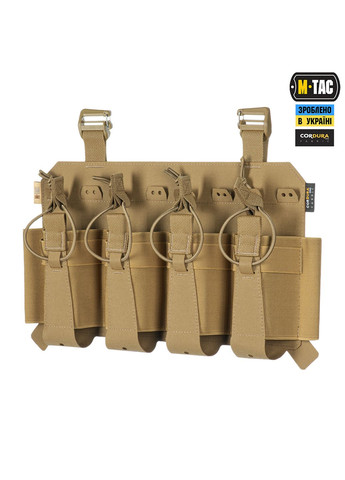 Функціональний та легкий підсумок розроблений дизайнерами бренду М-Тас спеціально для М-Тас чохла бронежилета Sturm та дозволить надійно розмістити 4 магазини серії АК/AR, забезпечуючи швидкий доступ до магазинів під час виконання бойових завдань. Виготовлений з еластичної резинки у поєднанні з Cordura Squadron – високотехнологічним матеріалом, стійким до стирання та високих навантажень. Система фіксації магазинів здійснюється за допомогою еластичної резинки та страхової стропи з «вушками», що забезпечують надійний захист від випадання. Завдяки продуманій конструкції, робоча поверхня хвату магазина залишається відкритою, тому маніпуляції з ним відбуваються набагато швидше. Універсальна форма дозволяє помістити портативну радіостанцію, чи інше подібне за розміром спорядження. З боків дизайнери передбачили еластичні резинки для кріплення хімсвітла та маркера. Фурнітура Woojin в поєднанні з велкро липучкою дозволяють прикріпити панель на передній частині чохла бронежилета Sturm. Підсумок забезпечить швидке перезаряджання та стане необхідним елементом індивідуального спорядження бійця. Матеріал: Cordura Squadron Розмір: 31.5 х 18.5 см