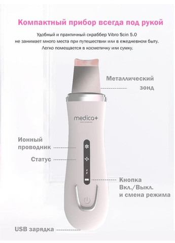 Опис: Сучасний ультразвуковий скрабер для обличчя VibroSkin 5.0 створений для підтримки краси та здоров'я шкіри. Прилад працює за допомогою впливу високочастотної ультразвукової вібрації — дає можливість провести якісне чищення та догляд за обличчям у домашніх умовах. Ультразвуковий скрабер допомагає сироваткам та іншим косметологічним засобам для догляду, глибоко проникнути у ваші пори для максимальної абсорбції й ефекту. Ультразвукові хвилі сприяють Найкраще кровообігу у верхніх шарах епідермісу виводить шлаки, які збираються глибоко в порах, видаляються мертві клітини нижньої частини шкіри. Використання ультразвуку дає змогу глибоко вбиратися косметичним засобам (сироваткам) для догляду за шкірою. Сприяє покращенню стану здоров'я та кольору шкіри. За допомогою високої частоти ультразвукових хвиль відбувається глибоке очищення, проникнення та живлення шкіри. Ультразвук підвищує температуру шкіри в зоні впливу на 1-2 градуси, викликаючи прискорення обмінних процесів: Оновлюється шкіра. Пришвидшується кровообіг. Посилюється лімфодренаж. Запускається утворення нових молекул колагену, серотоніну та інших активних речовин. Відлущування старої шкіри. Показання до застосування ультразвукового скрабера для обличчя VibroSkin 5.0: Груба, ороговіла шкіра. Пігментні плями, веснянки, нерівний колір обличчя. Блиск на обличчі. Наявність шрамів, рубців, постакне. Величезна кількість чорних цяток. Відповідна для будь-якого типу шкіри. Зморшки. Три режими роботи: Ліфтинг. Зволоження. Очищення. Комплектація: сакрабер ультразвуковий, зарядний кабель, посібник користувача (Англійським і на Русському), гарантійний талон, транспортувальне паковання. Виробник: MEDICA+ (Японія). Гарантія: 1 рік
