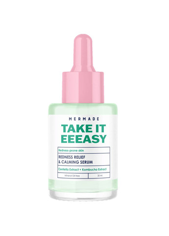 Розслабся...подаруй своїй шкірі глибокий спокій Заспокійлива сироватка Mermade Take It EEEasy для шкіри обличчя, що схильна до подразнень та почервонінь. Допомагає заспокоїти подразнену шкіру, помітно зменшити прояви почервонінь, зробити шкіру більш гладенькою на дотик. Окрім того, рослинні екстракти, що містяться у складі дозволяють відновити водно-жировий баланс шкіри, нейтралізувати вільні радикали, підтримуючи шкіру пружною та відновленою. Які основні переваги?Легка емульсійна текстура з оксамитовим приємним фінішем, надасть шкірі приємну мʼякість, а активні компоненти допоможуть відновити та заспокоїти подразнену шкіру. Для якого типу шкіри підходить сироватка для обличчя?Для шкіри схильної до подразнень та почервонінь, для проблемної шкіри. Який ефект після використання?Шкіра має більш рівномірний рельєф, прояви почервонінь та запалень менш помітні. Шкіра гладенька на дотик та відновлена. Факти про формулу:Формула розроблена з урахуванням потреб шкіри схильної до подразнень. Комплекс екстрактів та олій підібраний таким чином, щоб бути максимально дієвим проти проявів подразнень та почервонінь шкіри. Як використовувати сироватку для обличчя?Нанести кілька крапель сироватки на обличчя, рівномірно розподілити. Для кращого ефекту рекомендуємо використати нефритовий або кварцевий ролер. Ми розробили цю формулу:На основі легкої емульсійної есенції, без мінеральної олії, без силіконів. Аромат.Сироватка має легкий травʼянистий аромат, що підкреслює її насиченість рослинними екстрактами.
