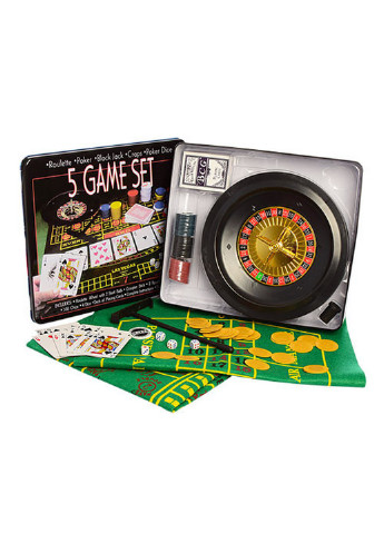 Відправка протягом 1-3 робочих днів. Настільна гра D25354 5 в 1 включає в себе: покер рулетка фішки карти кубики сукно 2 шт, в коробці (метал): 33х29х7 см