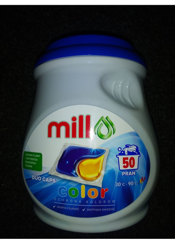 Капсули Mill Duo Caps складаються з двох активних компонентів, які завдяки своїй активній формулі ефективно видаляють забруднення на кольорових тканинах, одночасно захищаючи тканини від передчасної втрати кольору. Одна капсулка розрахована для прання одягу 4,5 кг. Якщо кількість речей перевищує,або є великі забрудненна, рекомендовано використати 2 капсулки. Цими капсулами можна користуватись при температурах від 30*С до 90*С. Упаковка пластикова ,в складі 50 капсул.