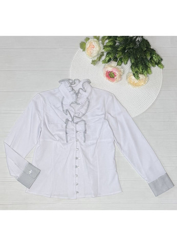 Нарядна біла блузка для дівчинки з рюшами та контрастними деталями Вишукана блузка для дівчинки — ідеальний вибір для школи, святкових подій або офіційних заходів. Модель прикрашена елегантними рюшами з контрастним кантом у тонку смужку, що додає образу стилю й оригінальності. Манжети та планка коміра також виконані з тканини в смужку, гармонійно поєднуючись із загальним дизайном. Характеристики: Комірець-стійка з оздобленням у смужку Декор — подвійні рюші спереду, окантовані смугастою тканиною Манжети — широкі, контрастні, на ґудзиках Застібка — планка на гудзиках по центру Силует — злегка приталений, з відрізною лінією талії Матеріал — щільна, гладка тканина приємна до тіла Колір — білий із сірими акцентами Переваги: Акуратний та елегантний вигляд Ідеально підходить під піджак або сарафан Комфортна в носінні, не сковує рухів Практична у догляді — зберігає форму після прання Чудовий вибір для юної леді, яка хоче виглядати стильно та охайно щодня!