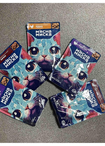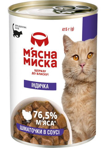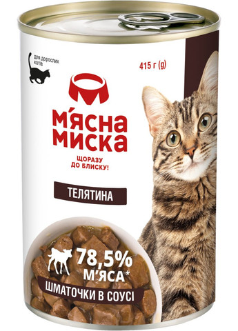 М'ясна Миска — це новий стандарт корму економкласу. Пауч М'ясна Миска за смаковими властивостями можна вважати делікатесом, але це готовий до щоденного та постійного годування корм. Високий відсоток вмісту м'ясних інгредієнтів у ньому дає змогу легко конкурувати з їжею, приготованою в домашніх умовах або зі столу, але має стабільну промислову якість спеціалізованого заводу, що набагато корисніше. Склад: м'ясо та субпродукти тваринного походження – 81% в шматочках (зокрема з курки – 42,5%, з яловичини – 31,0%, печінки – 7,5%), злаки. Поживні добавки (на 1 kg (кг) корму): таурин (3а370) – 225 mg (мг); вітамінно-мінеральний комплекс: вітамін D3 (3а671) – 75 IU (МО), вітамін Е (3а700) – 22,5 mg (мг), вітамін В1 (3а821) – 2,2 mg (мг), вітамін В2 (3а825і) – 1,6 mg (мг), вітамін В6 (3а831) – 1,2 mg (мг), вітамін В12 – 11,2 mcg (мкг), ніацинамід (3а315) – 15 mg (мг), кальцій-D-пантотенат (3а841) – 3,7 mg (мг), фолієва кислота (3а316) – 0,4 mg (мг), біотин (3а880) – 30 mcg (мкг); мікроелементи: залізо (3b103) – 13,5 mg (мг), мідь (3b405) – 1,0 mg (мг), кремній (Е551а) – 15 mg (мг), цинк (3b605) – 12,5 mg (мг), марганець (3b502) – 1,0 mg (мг), йод (3b201) – 0,22 mg (мг), селен (3b801) – 0,06 mg (мг). Енергетична цінність (калорійність) на 100 g (г) корму: 377,5 kJ (кДж) / 90,2 kcal (ккал). Поживна цінність (аналітичний склад): сирий протеїн – 7,9%, сирий жир – 4,3%, сира зола – 2,3%, сира клітковина – 0,05%.
