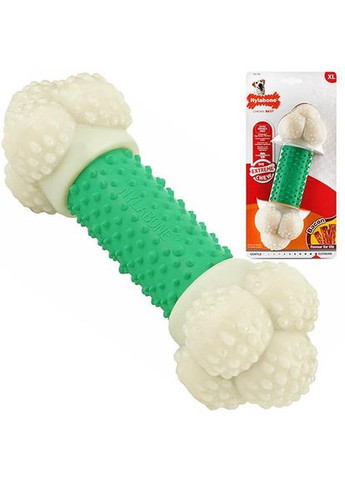 Задовольніть природну потребу вашого собаки гризти і жувати і зробіть ставку на кісточку Nylabone Подвійна дія! Ця іграшка має зручну для хвату форму гантелі та 2 зони з різними ароматами. Спокусливий бекон буде манити вашого вихованця гризти білу нейлонову основу, а свіже дихання подарує центральна вставка з покриттям з гуми, де присутній м'ятний аромат. Це відмінний спосіб зайняти вихованця у вашу відсутність, допомогти позбутися нудьги та стресу, переключити його від деструктивного гризіння до використання жувальних іграшок. Результат: собака насолоджується іграшкою, а ви – її свіжим диханням, неушкодженим інтер'єром та цілим взуттям. Іграшка для собак Double Action має текстуровану поверхню, яка м'яко масажує ясна, сприяє очищенню зубів та перешкоджає утворенню зубного нальоту та зубного каменю. Зверніть увагу, що центральна частина із зеленим гумовим покриттям трохи м'якша за жорсткі краї. Нейлонова (біла) частина Nylabone Double Action має смак бекону, який посилить привабливість іграшки для вашого вихованця. Варто відзначити, що смак зберігається доти, поки собака буде гризти цю кісточку. Технологія виготовлення товарів Nylabone унікальна тим, що ароматизатор не розпорошується поверхнею і не включений тільки в покриття, іграшка буквально просочена ним. Тому немає жодних шансів, що цей смачний аромат з часом пропаде чи собака його злиже. ВАЖЛИВО! Nylabone Double Action – не є ласощами! Іграшка не призначена для їжі! Не давати цуценятам, у яких повністю не змінилися всі зуби на незмінні. Чому варто купити жувальну іграшку для собак Nylabone Double Action: перешкоджає деструктивному гризенню, виробляючи у вихованця правильну звичку жування іграшок, що вбереже від знищення ваші меблі та взуття; допомагає позбутися нудьги, стресу і зайняти собаку за вашої відсутності; схвалена ветеринарами; відноситься до серії Extreme Chew – для собак із активним стилем гризіння; догляд за зубами: спеціальна текстура поверхні масажує ясна, сприяє очищенню зубів та перешкоджає утворенню зубного нальоту та зубного каменю; насичений смак бекону посилює привабливість жувальної іграшки для собак, аромат зберігається протягом усього часу, поки ваш вихованець її гризтиме; освіжає подих завдяки центральній гумовій вставці, насиченій м'ятним ароматом; контроль ваги: жування іграшки не впливає норми добового раціону собаки; матеріал виготовлення – міцний нейлон та гума; легко утримувати в чистоті - достатньо промити теплою водою (аромат при цьому не пропаде); ароматизатор бекону не містить інгредієнтів тваринного походження. Країна виробник: США.