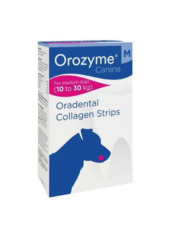 Жувальні смужки Orozyme з колагеном для собак містять ферменти, які покращують антибактеріальний ефект слини тварини. Додані речовини (антисептики) знижують кількість бактерій, відповідальних за неприємний запах, утворення нальоту та зубного каменю. Під час жування смужки Орозім не розпадаються завдяки спеціальній технології обробки колагеном. У процесі поїдання продукту задовольняється природний інстинкт вихованця — жування. Смужки не містять цукру, штучних барвників, підсилювачів смаку. Низький вміст жиру, гіпоалергенність засобу робить його придатним для собак із чутливим травленням та зайвою вагою. Особливості та переваги : сприяють усуненню неприємного запаху з рота; усувають зубний камінь та наліт (абразивний ефект); можна підібрати для представників маленької, середньої чи великої породи; не містять цукру, штучних барвників, підсилювачів смаку; містять запатентовану формулу ферментів, що покращує антибактеріальну дію слини собак; легко засвоюються (низький відсоток жиру); гіпоалергенний продукт; не мають протипоказань; підходять для щоденного догляду за ротовою порожниною та зубами; схвалено та рекомендовано ветеринарами; задовольняють природний жувальний інстинкт собаки. Small: для собак вагою до 10 кг (приблизна кількість пластин в упаковці – 20 шт.); Medium: для собак вагою від 10 до 30 кг (приблизна кількість пластин в упаковці - 18 шт.); Large: для собак вагою від 30 кг (приблизна кількість пластин в упаковці – 9 шт.). Дозування: 1 смужка на день після приймання їжі. Застереження: якщо ваш собака схильний швидко поглинати їжу, контролюйте процес жування смужки, щоб переконатися, що продукт належним чином пережовується. Умови зберігання: зберігати у сухому місці, при кімнатній температурі. Дуже важливо добре закривати алюмінієвий пакет після кожного використання, щоб запобігти втраті ефективності продукту.