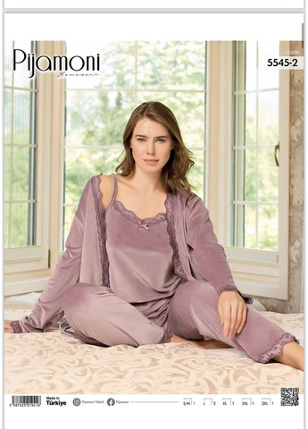2XL: довжина майки – 63 см., ОГ майки – 90, довжина халата – 82 см., довжина рукава халата від шва – 61 см., довжина штанів 104 см., гумка талії – 76 см.