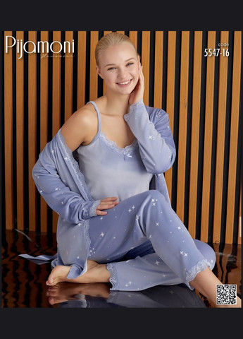 S/M: довжина майки – 60 см., ОГ майки – 80 см., довжина халата – 80 см., довжина рукава халата від шва – 60 см., довжина штанів 100 см., гумка талії –64 см.