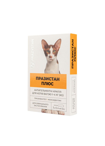 ОПИС Краплі на холку для котів Празистан Плюс – це ендопаразитицид зовнішнього застосування. Комбінація діючих речовин, що входять до складу препарату, забезпечує широкий спектр протипаразитарної дії у відношенні личинкових та статевозрілих форм кишкових нематод, личинкових форм (мікродирофілярій) нематод Dirofilaria spp.; цестод, трематод. СКЛАД 1 мл препарату містить: - діючі речовини: празіквантел (40 мг), моксидектин (10 мг); - допоміжні речовини: ефірна олія гвоздики, ефірна олія ялівцю, ароматизатори, спирт бензиловий, диметилсульфоксид, N-метил-2-піролідон, гліцероформаль, спирт ізопропіловий. ПОКАЗАННЯ Лікування та профілактика котів при: - нематодозах: токсокарозі, токсаскарозі, анкілостомозі, унцинаріозі, трихурозі, профілактика личинкових форм мікродирофілярій Dirofilaria spp.; - цестодозах: дипілідіозі, теніїдозах; - трематодозах: опісторхозі; - мікстінвазіях: дипілідіозо-сифонаптерозній, токсаскарозо-теніїдозній тощо. Застосування. Препарат застосовують шляхом крапельного (точкового) нанесення на суху непошкоджену шкіру в недоступному для злизування тваринам місці (на потилиці). При обробці тварин великих розмірів вміст піпетки наносять на шкіру у 3-4 точки вздовж хребта, від холки до хвоста. Профілактичну дегельмінтизацію проводять раз на місяць, а також за 12-14 днів до вакцинації. При сильній інвазії дегельмінтизацію рекомендується повторити через 10-14 днів. Дозування: 1 піпетка 0,4 мл на вагу до 4 кг, на вагу від 4 до 10 кг – 1 піпетка 1 мл. ЗАСТЕРЕЖЕННЯ Застосовувати кошенятам від 8-ми тижнів і/або масою тіла від 1 кг. Заборонене використання ослабленим, хворим та виснаженим котам. Дегельмінтизацію вагітних і годуючих самок, у разі необхідності, проводять під контролем лікаря ветеринарної медицини не пізніше ніж за 3 тижні до передбачуваних пологів і через 2-3 тижні після пологів. Препарат не слід наносити на вологу чи пошкоджену шкіру, мити тварину протягом 4 діб після обробки препаратом. Часте купання тварин з миючими засобами у період між обробками препаратом може знизити ефективність препарату. Термiн придатностi: 3 роки.