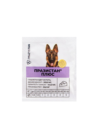 ОПИС Празистан - комбінований антигельмінтний препарат, до складу якого входять пірантелу памоат і празиквантел. Має широкий спектр антигельмінтної дії для профілактики та лікування при нематодозах (круглі гельмінти) і цестодозах (стьожкові гельмінти), що паразитують у собак та цуценят. СКЛАД 1 таблетка (0,8 г) містить: - діючі речовини: пірантелу памоат (150 мг) і празиквантел (50 мг); - допоміжні речовини: ароматизатор м’яса, наповнювач. ПОКАЗАННЯ Дегельмінтизація собак при ураженні круглими (нематоди) і стьожковими (цестоди) гельмінтами. Застосування. Таблетки задають перорально на корінь язика перед годуванням або в подрібненому вигляді одноразово з кормом, без дотримання голодної дієти. Профілактичну дегельмінтизацію проводять щокварталу (4 рази на рік), а також за 12-14 днів до вакцинації. При сильній інвазії дегельмінтизацію рекомендується повторити через 10 днів. Дозування: 1 таблетка на вагу від 5 до 10 кг (на вагу до 2 кг – ? таблетки, на вагу 2-5 кг – ? таблетки). Таблетка має розподільну риску, завдяки якій легко ділиться. А аромат м’яса покращує поїдання препарату. ЗАСТЕРЕЖЕННЯ Застосовувати цуценятам віком від 6 тижнів. Заборонене використання хворим та слабким собакам. Не застосовувати самкам у першій половині вагітності і протягом двох тижнів після пологів. Не застосовувати одночасно з піперазином і препаратами, які інгібують холінестеразу. Термiн придатностi: 3 роки.