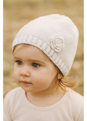 Дитяча в’язана шапка білого кольору – ніжний та практичний аксесуар для малечі. Виконана з м’якої трикотажної пряжі, яка добре тягнеться, зберігаючи форму й забезпечуючи комфорт протягом усього дня. Низ оформлений еластичною резинкою, що надійно фіксує шапку на голові. Особливий акцент – в’язана квітка збоку, яка додає виробу милого та святкового вигляду. Легка й тепла, ідеально підходить для прохолодної осені та весни.