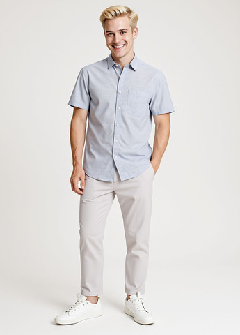 Сорочка звичайного крою з бавовняного матеріалу. Комір класичний, на ґудзиках, рукав короткий, спереду накладна кишеня.