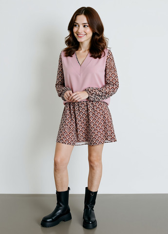 Міні-сукня з принтом, V-подібний виріз, довгі рукави з манжетами на резинці.