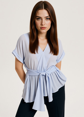 Виріз із запахом, короткі рукави з закладеними манжетами, еластичний пояс, ефектна зав’язка. На моделі розмір S/36 . Зріст моделі: 178 см.