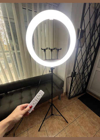 Кільцева світлодіодна лампа RL-18 45 см + штатив 210см, з 3 тримачами для телефону. Кільцева лампа на штативі використовується як додаткове освітлення при проведенні фото- та відеозйомки. У комплекті з лампою йдуть 3 тримачі для телефону, які встановлюються в центр лампи та бездротовий пульт. У кожен тримач можна встановити смартфон, з діагоналлю до 6,5 дюймів. Управління лампою здійснюється за допомогою сенсорних кнопок, розташованих на лампі, та пульта дистанційного керування, що йде в комплекті. Потужність лампи складає 55 Вт. Дана модель живиться від мережі 220В за допомогою мережевого блоку, який також йде в комплекті. Особливості: Стандартні режими: теплий (жовтий), денний (змішаний) та холодний (білий) Діаметр кільця лампи: 45 см Живлення лампи: від мережі 220В Загальна потужність: 55 Вт НІ ультрафіолетового та інфрачервоного випромінювання, низька теплова потужність, безпека та захист навколишнього середовища Колір обідку лампи: чорний Штатив 2,1 метр Характеристики: Тип: кільцева лампа Діаметр лампи: 45 см Колірна температура: 2700К-6500К Індекс кольору:> 90 Вхідна напруга: 220В Частота: 50-60 Гц Максимальна потужність: 55 Вт Світлий колір: холодне світло / тепле світло / натуральне світло Регульована яскравість: 10-100% (10 рівнів) Матеріал: АБС+ПК Комплектація: Кільцева лампа 45 см Тримач для телефону – 3 шт. Блок живлення 12V/5A (з адаптером для розетки) Шарнір (для кріплення лампи до штативу) Пульт управління (без батарейок) Штатив (до 2,1 м) Упаковка