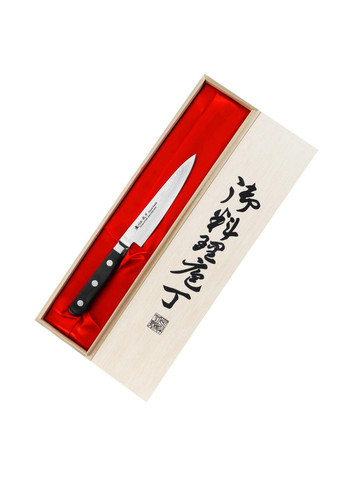 Характеристики Серія: Masamune Призначення: універсальний ніж Матеріал леза: молібден-ванадієва нержавіюча сталь Матеріал ручки: дерево магнолія Довжина леза: 120 мм Загальна довжина: 235 мм Ширина леза: 28 мм Товщина леза 1,2 мм Вага: 39 г Твердість сталі: 60 HRc Тип заточування: двостороння симетрична Колір коричневий Країна виробництва: Японія