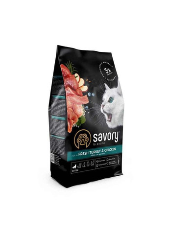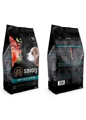 Корм для цуценят всіх порід класу холістик Savory – це збалансований раціон на кожен день. Найсмачніший ніжний смак та корисні, натуральні добірні інгредієнти у складі. Ексклюзивна рецептура цього корму була розроблена досвідченими європейськими фахівцями з харчування домашніх улюбленців. Їм вдалося, використовуючи холістичний підхід, створити біологічно відповідний здоровий раціон для собак, який є максимально корисним та поживним, і при цьому смачним. Більшість людей, які завели цуценя, піклуються про те, щоб харчування для організму, що росте, було поживним, смачним і корисним. Щоб забезпечити свого вихованця всім необхідним для повноцінного росту та розвитку, рекомендується сухий корм для цуценят з м'ясом свіжої курки та індички (а його в Savory Fresh Turkey & Сhicken Puppy All Breeds - 55%). Основний раціон зростаючих цуценят має складатися з білкових продуктів. Дієтичне м'ясо птиці забезпечить правильний баланс харчування, який не дозволяє можливості набору надмірної ваги. Крім того, повнораційний корм містить у своєму складі суперфуди, такі корисні фруктово-овочеві добавки, як м'якота яблук, цукіні та зелень шпинату. Переваги: містить цінне джерело білків - свіже якісне м'ясо індички; комплекс пребіотиків, пробіотиків та мінералів, що зміцнюють імунітет; не навантажує органи травної системи; збалансований раціон; наявність вітамінів та необхідних мінералів; хондропротектори зміцнюють та захищають суглоби; калорійність не перевищує допустимих норм; забезпечує здоров'я шкіри та ідеальний зовнішній вигляд шерсті; низькозерновий склад; відсутність у кормі ароматизаторів та барвників позитивно позначається на здоров'ї. Особливості : індичка – дієтичне, високобілкове м'ясо. Легко засвоюване, містить життєво необхідні мінерали: селен, цинк, натрій, фосфор, магній, калій та вітаміни групи B; курка - м'ясо з низьким вмістом вуглеводів, збагачене мінералами та вітамінами. Прекрасне джерело протеїну; яблука містять пребіотики (олігосахариди), які покращують мікрофлору кишківника; олія лосося - джерело цінних жирних кислот Омега-3. Підтримує імунітет, а також надає блиску шерсті вихованця; білий рис – дієтичний інгредієнт, що полегшує роботу травного тракту; цукіні містять розчинну клітковину, що цілюще впливає на органи травлення. Цей корисний овоч також є джерелом вітаміну С, що зміцнює захисні властивості організму; молоко кокоса має протизапальний ефект і бореться зі шкідливими бактеріями, перешкоджаючи їх розмноженню. Сприяє травленню, покращує стан шкіри та роботу серця; насіння чиа - містить кальцій, антиоксиданти, ненасичені жирні кислоти; насіння кіноа - суперфуд, що містить калій, рутин, мінеральні солі, каротин, ефірні олії, а також важливі для роботи шлунково-кишкового тракту пектин і клітковину; помідори - джерело антиоксидантів, що мають виражений протизапальний ефект та покращують стан шкірного покриву, мозкову та серцеву діяльність; шпинат - тут багато вітамінів групи В. Він знижує окисні процеси, що відбуваються в організмі й нормалізує артеріальний тиск. Склад: дегідратована курка (40%), рис, свіжа індичка (15%), курячий жир, горох, лососева олія, гідролізована куряча печінка, дріжджі, сушені яблука, сушені цукіні, сухе кокосове молоко (0,5%), насіння чіа (0,5%), насіння кіноа (0,5%), сушені томати (0,5%), сушений шпинат (0,5%), горохове борошно, курку