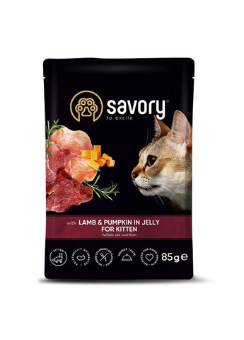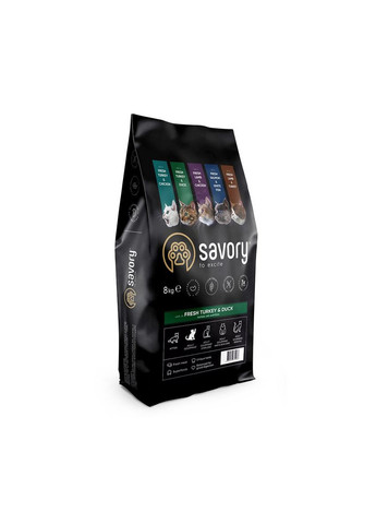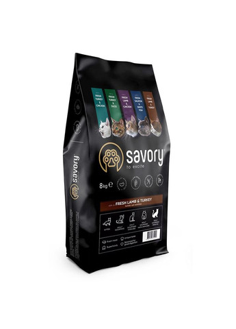Кожна серія має оптимальний баланс білків і жирів, а також містить омега-3 і омега-6 для підтримки шкіри та шерсті. Savory виготовляється за сучасною технологією низькотемпературного сушіння, що зберігає смак і поживність продукту.