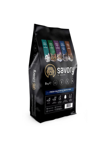 Корм Savory для котів — це преміальний вибір для турботливих власників, які хочуть бачити свого улюбленця здоровим, активним і задоволеним. Формули бренду створені за принципом “людського класу” (Human Grade): використовуються інгредієнти, придатні навіть для харчування людини. Сейворі — це баланс натурального білка, вітамінів і мінералів без штучних ароматизаторів чи барвників.