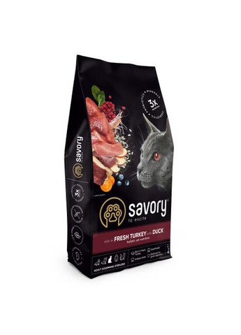 Корм класу холістик для котів. Повнораціонний сухий корм для котів Savory пробудить у вашого улюбленця ту життєву енергію, про яку він навіть сам ще не знав. Ексклюзивна рецептура корму була розроблена досвідченими європейськими спеціалістами з харчування домашніх улюбленців. Використовуючи холістичний підхід, вдалося створити біологічно відповідний, здоровий раціон для котів, який є корисним і смачним настільки, що лапки оближеш. Поєднання добірних натуральних інгредієнтів дає можливість піклуватися про здоров’я чотирилапого, а вишуканий смак – дарувати йому насолоду від щоденного споживання корму Savory. Сухий корм для котів Savory містить свіже м'ясо індички і дегідратоване м'ясо качки, ягоди, фрукти та овочі. Ці компоненти створені природою, щоб забезпечити котику для міцне здоров’я та енергію для щоденних розваг. Переваги: Свіже м'ясо індички та дегідратоване м'ясо качки – цінне джерело білків, які легко засвоюються та надають корму неперевершеного смаку. Унікальний комплекс пребіотиків, пробіотиків і мінералів підтримує здорове травлення та зміцнює імунітет. Підтримання оптимальної ваги – рівномірний набір м’язової маси без відкладання жиру. Суперфуди для гармонійного розвитку та комфорту травлення. Містить хондропротектори для здорового формування, зміцнення та захисту суглобів. Ягоди, фрукти і овочі – джерело антиоксидантів, вітамінів і флавоноїдів для довгого та здорового життя котика. Не містить штучних барвників і штучних ароматизаторів – підхід «NafNac». Особливості: Індичка - джерело цінного високобілкового м`яса, що містить велику кількість мінералів (селен, цинк, натрій, фосфор, магній, калій) та вітамінів (В3, В6, В12). Качка - альтернативне та смачне джерело протеїнів, з підвищеним вмістом антиоксидантів і з ідеальним амінокислотним складом. Зелений горох і рис. Білок зеленого гороху містить амінокислоти: метіонін, цистин, триптофан; має низький глікемічний індекс. У поєднанні з корисними цільнозерновими злаками (рисом) засвоєння такого протеїну відбувається максимально ефективно. Гарбуз - цінний дієтичний продукт, натуральне джерело корисної для кишківника клітковини, вітамінів і мінеральних речовин. Сушений антарктичний криль - натуральне джерело ейкозапентаєнової та докозагексаєнової кислот, необхідних для гострого зору, нормального функціонування мозку й здорової шкіри і шерсті. Сушена лохина – природний антиоксидант для боротьби з вільними радикалами, захисту і відновлення клітин організму. Сушена журавлина містить антиоксиданти і біофлавоноїди для профілактики розвитку шкідливої мікрофлори в сечовидільній системі. Ці ягоди підтримують здоров'я сечовивідних шляхів, регулюють кислотність сечі і є хорошим кишковим антисептиком. Яблука є джерелом пребіотиків (олігосахаридів), що покращують здоров'я мікрофлори кишечника. Шпинат – джерело вітамінів групи В. Знижує процеси окислення в організмі, нормалізує артеріальний тиск. Корм Savory – корисне може бути смачним! Склад: свіже м'ясо індички (15%), дегідратоване м`ясо качки (15%), зелений горох, коричневий рис, білий рис, дегідратоване м`ясо курки (6%), жир тваринного походження (курка, 6%), гідролізований протеїн тваринного походження (6%), сушений буряк, лососева олія (2%), мінерали, МОС та бетаглюкани, сушені пивні дріжджі, сушений цикорій (природнє джерело 