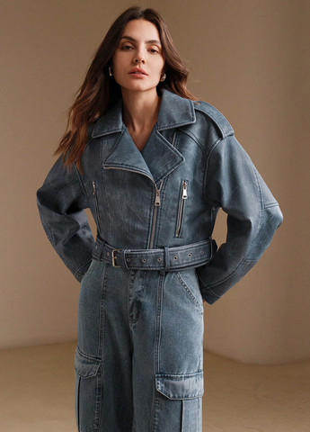 Куртка – ретро-джинсовий ефект. Ця жіноча куртка oversize має ефект потертого деніму. Вона має вільний крій та рукави з приспущеними плечима. Куртка включає кишені та застібку-блискавку. Тканина не тягнеться, має стандартний поділ та виріз із лацканами. Має планку із застібкою-блискавкою.
