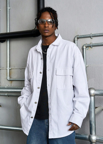 Чоловіча вільна біла джинсова сорочка. Ця сорочка має вільний крій та відкладний комір. Вона має застібку на гудзики спереду та спущені плечі. Сорочка включає кишені та виготовлена з нееластичного деніму.