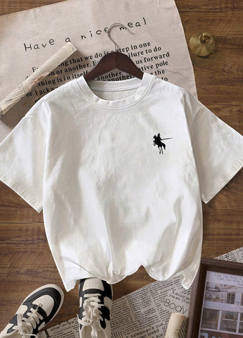 Жіноча повсякденна футболка з графічним принтом "Лицар-кінь". Біла трикотажна футболка з круглим вирізом та короткими рукавами. Підходить для повсякденного носіння, під час занять спортом, роботи в офісі та повсякденному житті. Тканина середньої еластичності. Догляд: машинне прання, не піддавати хімчистці.