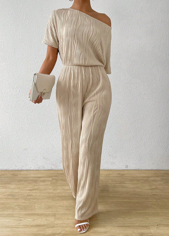 Літній комбінезон з асиметричним коміром і рукавами «кажан». Вільний крій із завищеною талією. Виготовлений з еластичної тканини