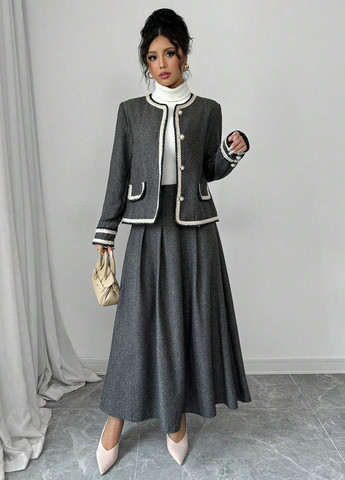 Цей жіночий комплект включає жакет на гудзиках і спідницю. Жакет має круглий виріз та застібку на гудзики спереду. Має звичайний крій з кишенями та контрастною окантовкою. Спідниця доповнює жакет звичайним кроєм. Тканина не тягнеться.