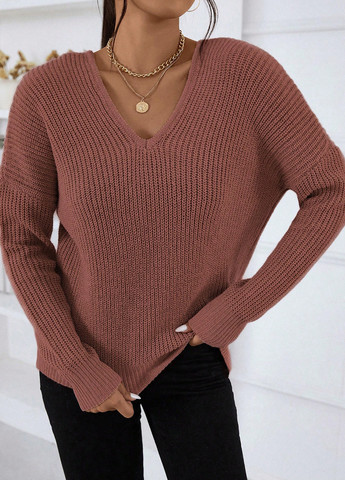 Светр Franclia однотонного теракотового кольору. Це светр звичайного крою з V-подібним вирізом та заниженими рукавами. Тканина еластична.