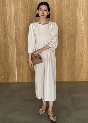 Сукня FRIFUL однотонного бежевого кольору. Має круглий виріз горловини, вільний крій та об'ємні рукави. Виготовлено із нееластичної тканини.