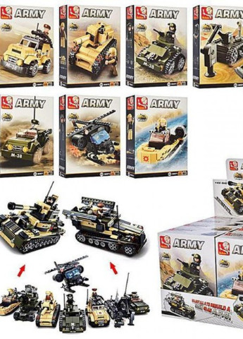 З восьми маленьких конструкторів можна зібрати два великі машини. Sluban безпечний для дітей, деталі добре з'єднуються. Всередині коробки детальна інструкція, фігурки та деталі, з яких можна зібрати різні конструкції. Характерики: Колекція деталей: 400+7. Розмір коробки: 52-38-8 см Серія: Армія Матеріал: Пластик Вік: 6+ Дитячі конструктори розвивають у дитини дрібну моторику рук, просторову уяву, стимулюється логічному та образному мислення, тренується пам'ять і увага. У дітей поліпшується координація рухів і розширюється кругозір, а це сприяє підвищенню чутливості й порядку. За запитом можна надіслати додаткові фото товару після обрамлення, при наявності видів - уточним необхідний