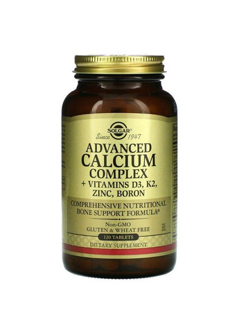 Комплекс Calcium Complex від Solgar поєднує найважливіші елементи для повноцінного мінерального обміну Розмір порції: 4 таблетки Кількість порцій: 30 Кількість на порцію від добової потреби** Вітамін D3 (холекальциферол) 25 мкг (1000 МО) 125% Кальцій (дикальцій малат†, цитрат, гліцинат амінокислотний хелат†) 1000 мг 77% Магній (димагній малат, цитрат, гліцинат амінокислотний хелат†, оксид) 500 мг 119% Цинк (гліцинат цинку амінокислотний хелат†) 5 мг 45% Мідь (мідь гліцинат амінокислотний хелат †) 0.5 мг 56% Марганець (марганець гліцинат амінокислотний хелат†) 2 мг 87% Натрій†† 30 мг 1% Вітамін К2 (менахінон-7 з екстракту натто) 65 мкг *** Бор (бору цитрат) 2 мг *** ..*** Добова потреба не визначена. ** Відсоток від добової потреби заснований на дієті 2000 калорій. † Патенти США № 6,706,904 та 6,716,814 ліцензовані Albion International, Inc. †† Зустрічається у природі.