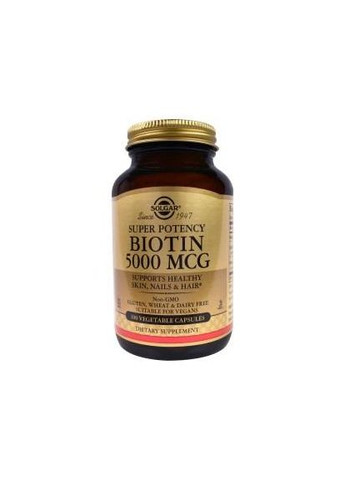 Опис Product Overview Description Since 1947 Super Potency Supports Skin, Nails & Hair Gluten, Wheat & Dairy Free Suitable for Vegans Non-GMO K-Parve Dietary Supplement Biotin is a water-soluble B-vitamin. It helps to support healthy skin, nails and hair, and is necessary for certain enzymes to work properly. Biotin also supports energy production in the body by converting food into energy, and is required for protein, carbohydrate, and fat metabolism. Suggested Use As a dietary supplement for adults, take one (1) vegetable capsule daily, preferably with a meal or as directed by a healthcare practitioner. Other Ingredients Microcrystalline cellulose, vegetable cellulose, vegetable magnesium stearate, silica. Free of: Gluten, wheat, dairy, soy, yeast, sugar, sodium, artificial flavor, sweetener, preservatives and color. Warnings If you are pregnant, nursing, taking any medications or have any medical condition, please consult your healthcare practitioner before taking any dietary supplement. It is advisable to consult your healthcare practitioner before using biotin doses above 2,500 mcg per day. If any adverse reactions occur, stop use and consult your healthcare practitioner. Keep out of reach of children. Store at room temperature. Do not use if outer bottle is missing or damaged. Disclaimer While iHerb strives to ensure the accuracy of its product images and information, some changes to manufacturing packaging and/or ingredients may be pending update on our site. Although items may occasionally ship with alternate packaging, freshness is always guaranteed. We recommend that you read labels, warnings and directions of all products before use and not rely solely on the information provided by iHerb. Supplement Facts Serving Size: 1 Vegetable Capsule Amount Per Serving %DV Biotin 5000 mcg 1667% Calcium (as dicalcium phosphate) 148 mg 15% Phosphorus (as dicalcium phosphate) 115 mg 12% DV = Daily Value Відмова від відповідальності У зв'язку з тим, що виробник часто змінює дизайн упаковки та не завжди своєчасно надає нові фото, оновлення даних може відбуватися із затримкою. Наш інтернет-магазин робить все можливе, щоб зображення та інформація про продукцію були надані своєчасно та коректно. Навіть у випадках, коли маркування отриманої Вами продукції відрізняється від наданої на сайті, ми гарантуємо якість та оригінальність товарів. Ми рекомендуємо ознайомитися з інструкцією щодо застосування, вказаною на товарі, перед використанням, а не повністю покладатися на опис, наданий на сайті. Вся продукція, представлена на нашому сайті – Біологічно активні добавки до їжі (БАД) не є лікарськими засобами та не застосовуються для лікування будь-яких захворювань. Перед застосуванням біологічно активних добавок до їжі рекомендується проконсультуватись із лікарем. Біологічно активні добавки до їжі (БАД) не підлягають обов'язкової сертифікації. Відповідно до нової редакції закону України «Про основні засади безпеки та якості харчових продуктів» видання санітарно-епідеміологічних висновків на БАД було скасовано.