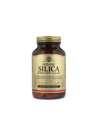 ОПИС Кремнезем, отриманий з морського порошку морських водоростей (Lithothamnion corallioides), є джерелом природного мікроелемента кремнію. Додаткове вживання цього елемента благотворно впливає на здоров'я опорно-рухової системи організму. Водночас кремній відповідає за еластичність судин, перешкоджає їхній кальцифікації. Нестача кремнію спостерігається внаслідок неправильного харчування (відсутність у раціоні грубих харчових волокон), а також у період інтенсивного росту організму. За тривалого дефіциту елемента значно підвищується ризик розвитку атеросклерозу, інсульту та інфаркту міокарда. Особливо рекомендується приймати кремній людям похилого віку, щоб уникнути подібних захворювань. ДІЯ КРЕМНІЮ нормалізує обмін речовин; бере участь у природному синтезі різних ферментів і гормонів; відіграє ключову роль у повноцінному засвоєнні організмом людиною понад 70 вітамінів і мінеральних речовин; стимулює процес природного вироблення організмом людини білків колагену і кератину, сприяючи тим самим зміцненню стінок кровоносних судин, клітин шкіри, кісткової і хрящової тканини, поліпшенню стану нігтів і волосся; чинить протизапальну дію; покращує регенеративні процеси в організмі, різних органах і тканинах; стимулює діяльність імунної системи; відіграє важливу роль у профілактиці серцево-судинних захворювань, оскільки підтримує еластичність артерій; уповільнює процеси старіння в тканинах; бере участь у процесі мінералізації кісткової тканини; покращує на провідність нервових волокон і функцію деяких структур головного мозку; полегшує видалення із сечею токсичних речовин; сприяє засвоєнню кальцію та росту кісток, попереджає остеопороз; РЕКОМЕНДАЦІЇ для правильного формування кісткової та хрящової тканини; для підтримки судин еластичними та міцними; для кращого засвоєння кальцію та інших мінералів; для підвищення опірності організму до впливу негативних факторів; для поліпшення роботи нервової системи; для поліпшення стану волосся, нігтів і шкіри; для уповільнення процесу старіння організму. Рекомендації щодо застосування:приймати по двікапсули на день, переважно під час їди, або за приписом лікаря. Склад Порція: 2 капсули Порцій в упаковці: 50 В одній порції % від добової потреби Кальцій 200 мг 15% Силікагель (з червоного порошку водоростей (Lithothamnium coralloides)) (50 мг кремнію) 108 мг * * Добова норма не визначена Інші інгредієнти: Целюлоза, стеаринова кислота, кремнезем і стеарат магнію. ПОПЕРЕДЖЕННЯ У разі вагітності, годування груддю, прийому будь-яких медичних препаратів або наявності будь-яких захворювань слід проконсультуватися з лікарем перед вживанням. Зберігати в недоступному для дітей місці. Зберігати в сухому прохолодному місці. Не використовувати, якщо зовнішня захисна мембрана відсутня або пошкоджена.