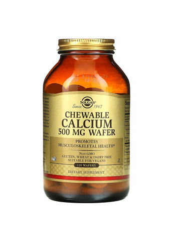 Жувальний кальцій від Solgar - це зручна форма мінеральної добавки, призначена для щоденного вживання з метою підтримки нормального стану кісткової тканини Розмір порції: 2 вафлі Кількість порцій: 60 Кількість на порцію % від добової потреби** Калорії 10 Всього вуглеводів 2 г <1%** кальцію) 1000 мг 77% ** Відсоток від добової потреби ґрунтується на дієті в 2000 калорій. *** Добову потребу не визначено.