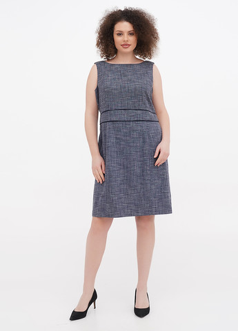 Сукня сіро-синій меланж, на підкладці, міді та нижче коліна, відрізна по лінії талії, на спині застібка на блискавці, круглий виріз горловини, без коміра, без рукавів, широка лінія талії, шліця. На розмір 18 напівобхват грудей – 58 см, напівобхват талії – 50 см, довжина по спинці – 100 см.